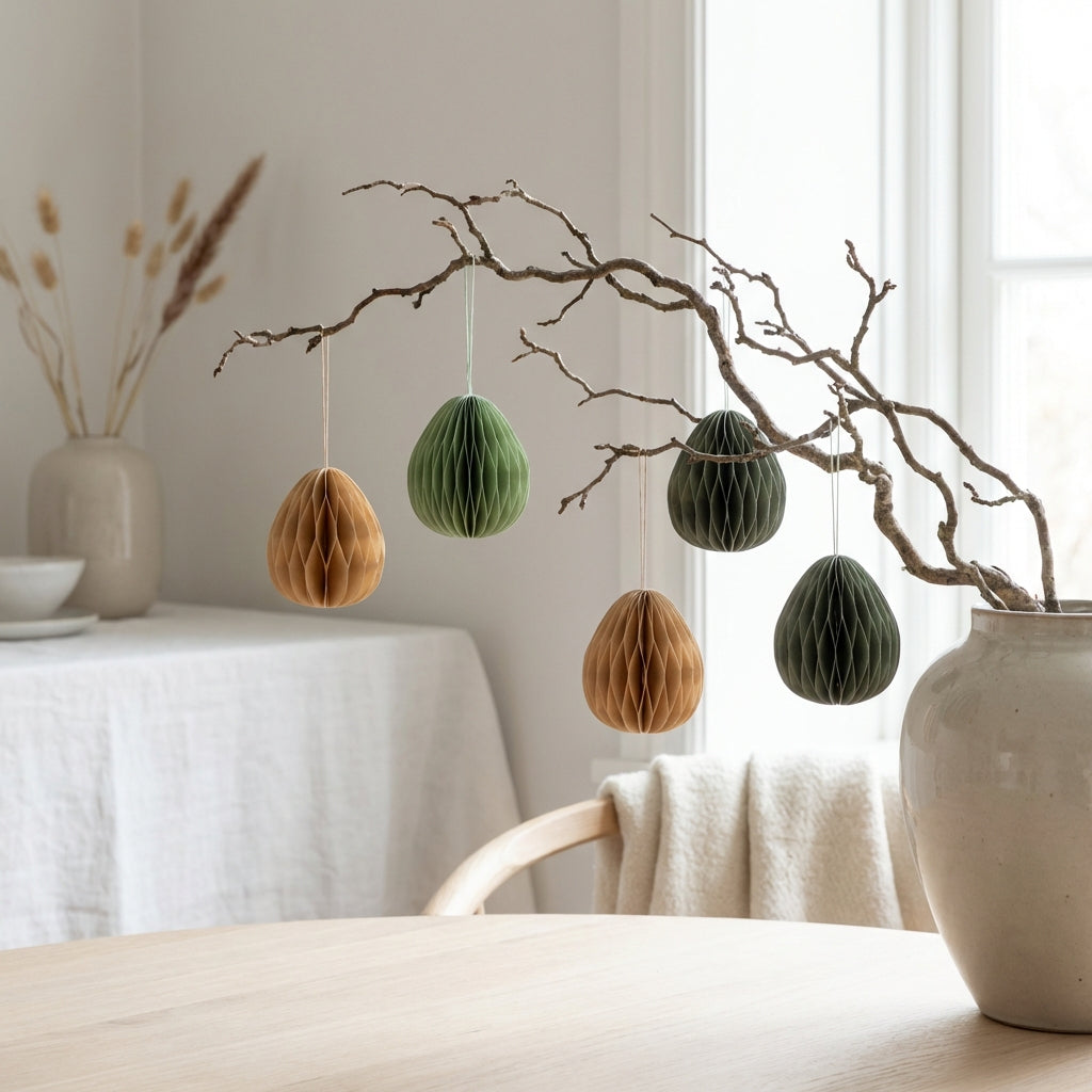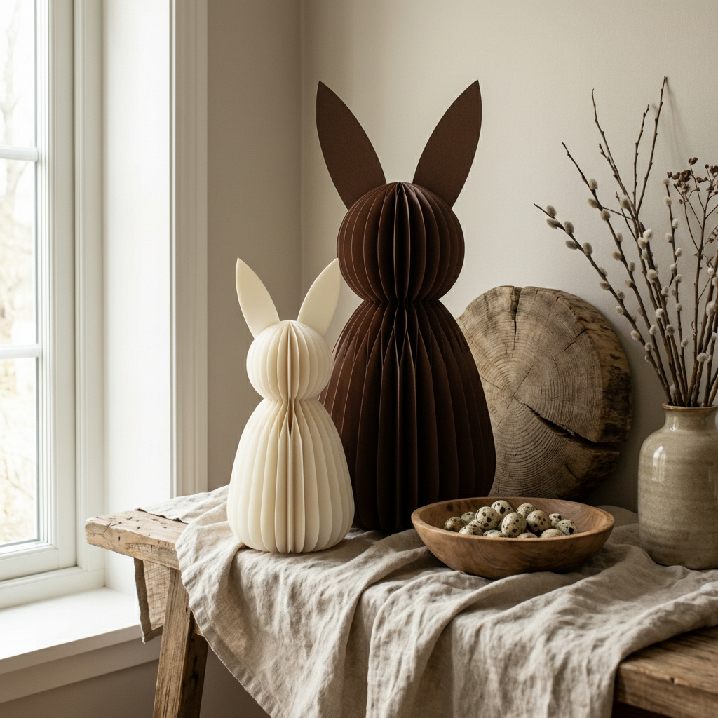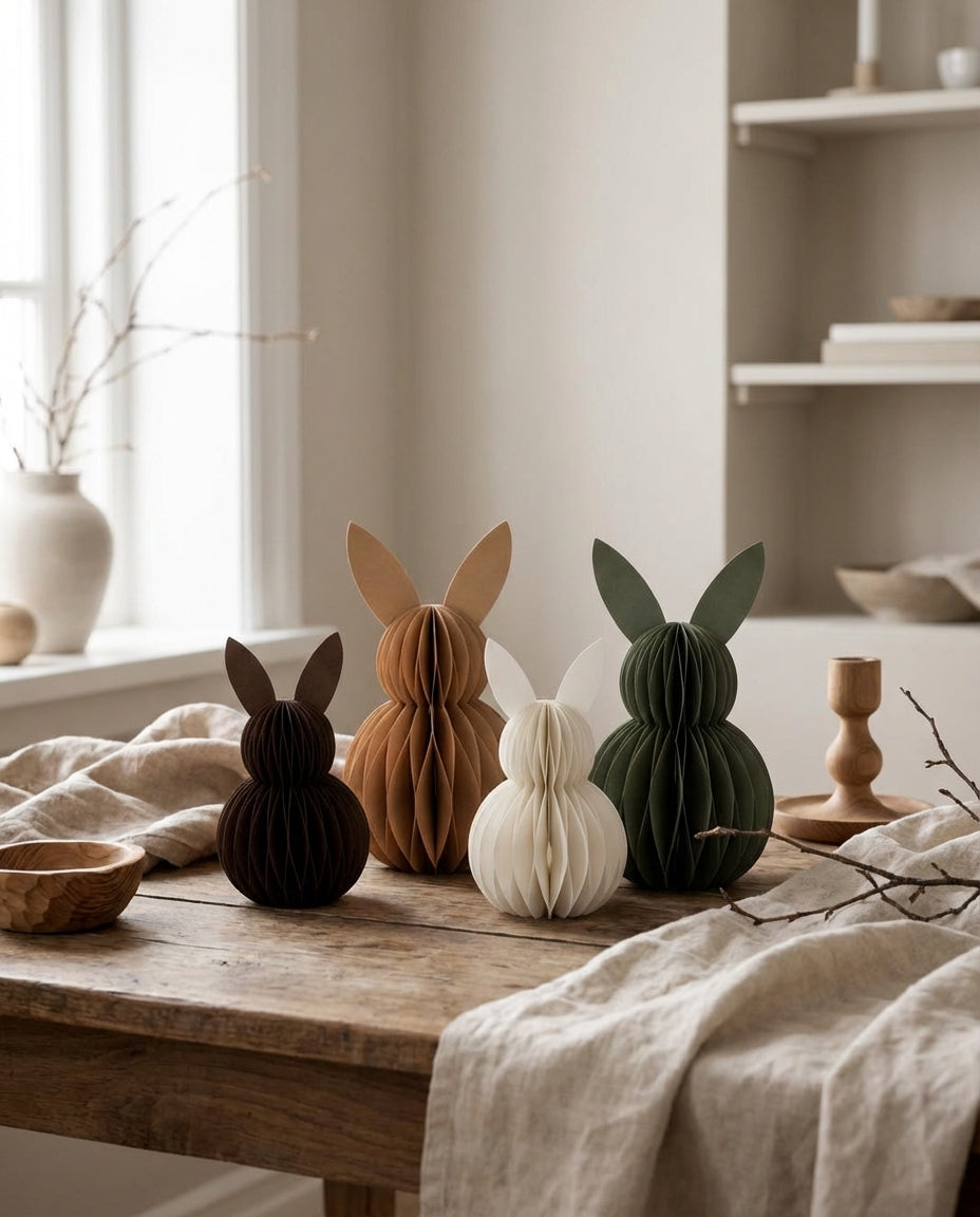 PapierdekorationKleine Papierhasen & Ostereier für eine stilvolle Oster- und Frühlingsdeko. Perfekt für die Ostertafel, Fensterbänke und liebevolle dekorative Akzente im ganzen Zuhause. Nachhaltig & wiederverwendbar.