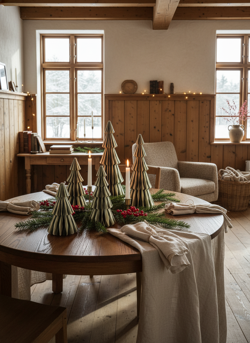 Kleine Papierbäume & Ornamente für eine stilvolle Tischdeko. Perfekt für Weihnachten, festliche Tafeln und dekorative Akzente im ganzen Zuhause. Nachhaltig & wiederverwendbar.